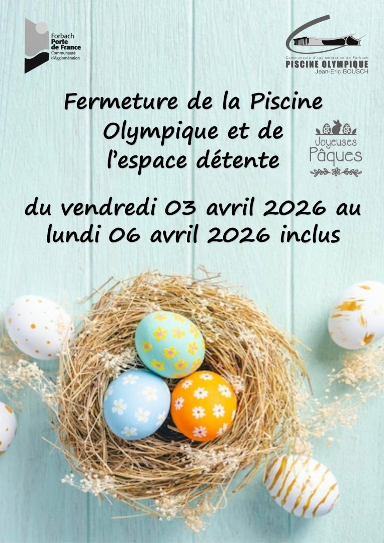 Publiée le 30 Mars 2026 La piscine et son espace détente seront fermés du 3 au 6 avril 2026 inclus. Partager sur FacebookPartager sur TwitterPartager par email Retour à la liste des actus